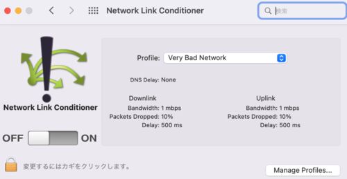 Macにおいて、ネットワーク帯域の制御などはNetwork Link Conditionerで対応可能です。 下記ページよりAdditional Tools for Xcode を探してdmgをダウンロードし、その中にあるNetwork Link Conditioner.prePane からインストール可能です。 https://develop…